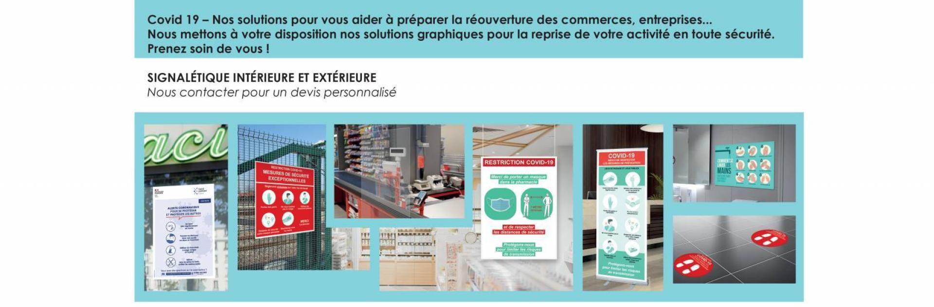 Nous mettons à votre disposition nos solutions graphiques pour la reprise de votre activité en toute sécurité.Prenez soin de vous !SIGNALÉTIQUE INTÉRIEURE ET EXTÉRIEURE